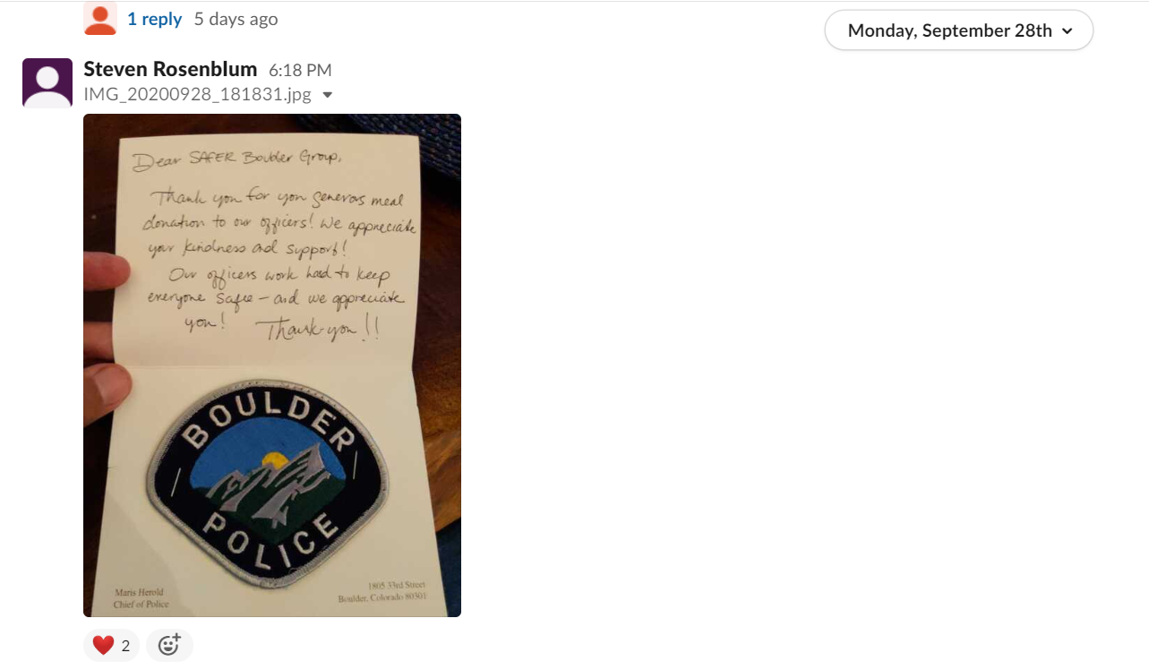 Safer Boulder has a special hatred for local progressive activists. Their Slack workspace contains several posts encouraging members to “spy on” activist groups. One user “infiltrated” Boulder Progressives by signing up for their mailing list.