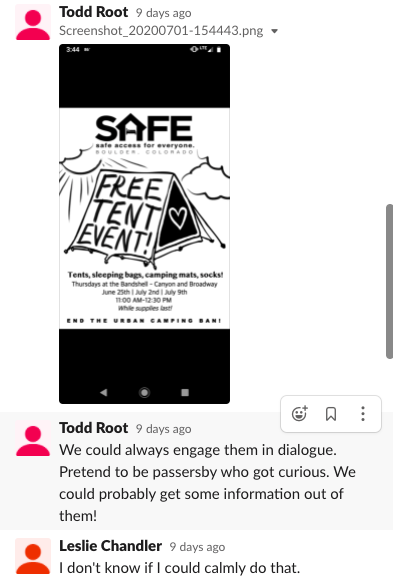 The Safer Boulder Slack group includes a channel called “#photos,” in which they share pictures to document the activity of the homeless around town. Some of these pictures show tents, litter, and other objects. Others depict houseless people, many of them sleeping. It is obvious that these photos are taken and shared without consent with the intent to mock and humiliate their subjects.